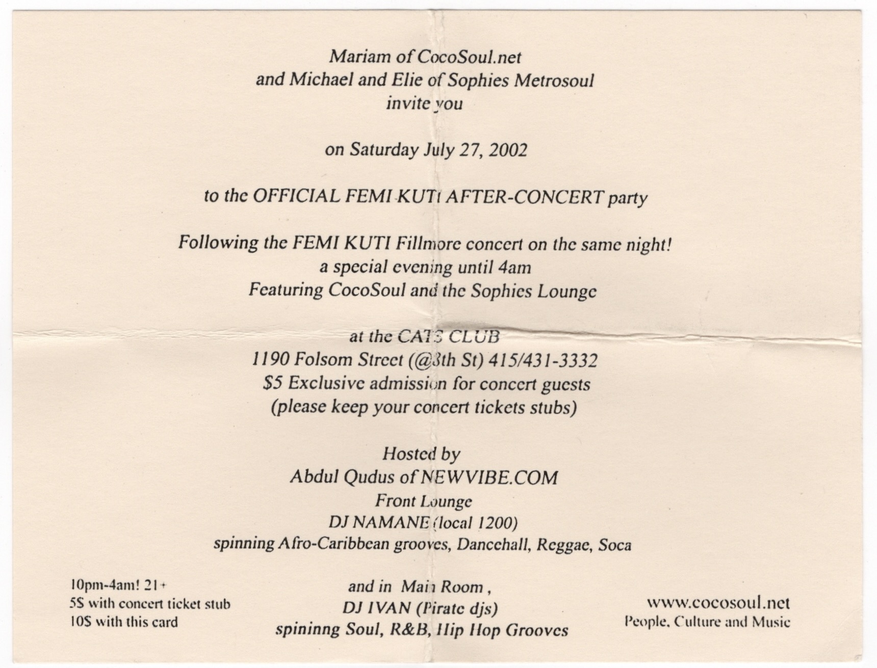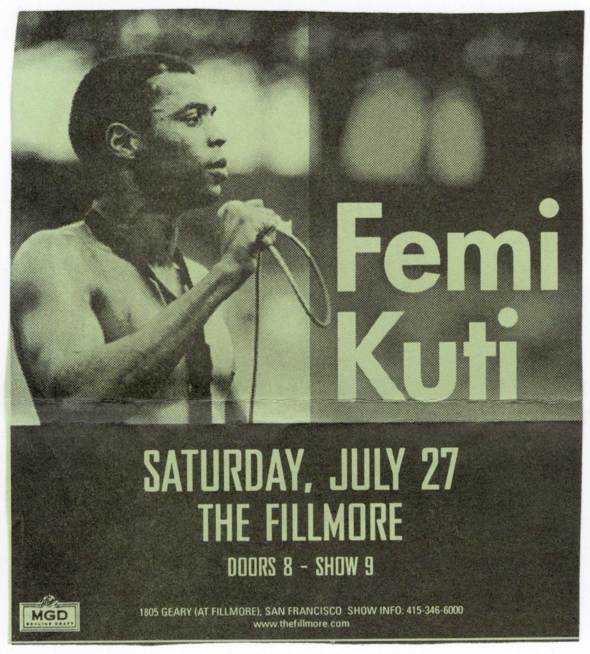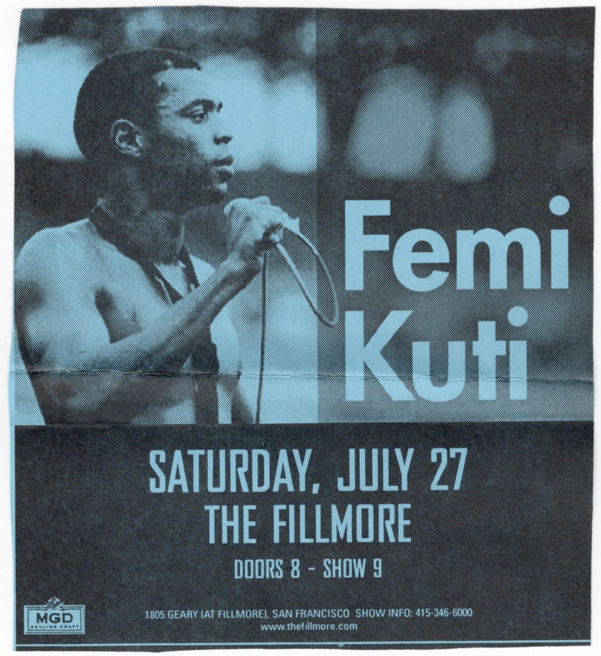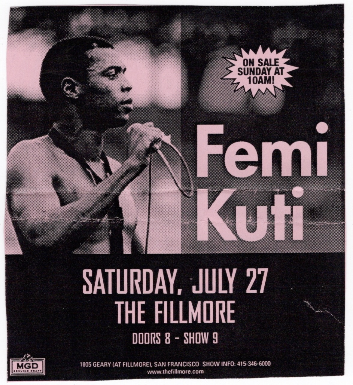 He livened things up after, getting the crowd to do the usual call and response chanting and there were a lot of talented dancers on and off the stage. Halfway through the set, Femi got us all to step together, “To the right, the the left, to the right, to the right” and later dance low to the ground. There was no poster that night, but I would see Mr. Kuti again on that stage two years later, though I wouldn’t see him again until 2018 at Stern Grove. I am happy to say that the Kuti musical line is in good hands with Femi’s son, Seun Kuti, who had been performing with his dad since he was nine years old, singing and playing sax. He has since grown into an extremely talented headliner of his own who I’ve seen a couple times playing alongside his father’s old band, Egypt 80.