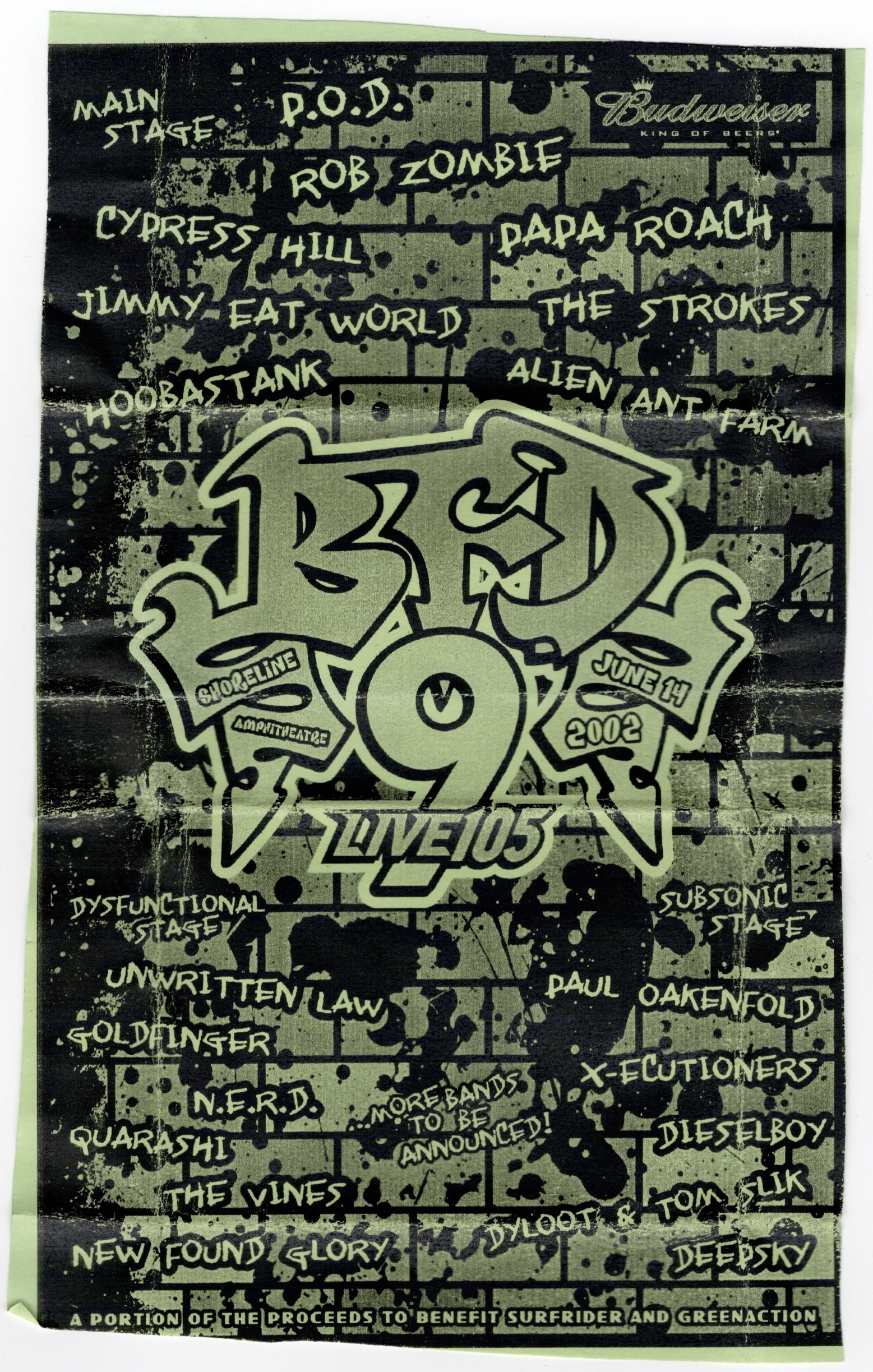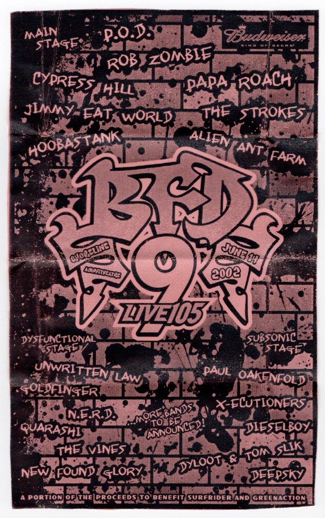 Live 105’s BFD 2002: P.O.D., Papa Roach, Paul Oakenfold, Cypress Hill, Rob Zombie, New Found Glory, The Strokes, Jimmy Eat World, Hoobastank – Shoreline, Mountain View, Fri., June 14