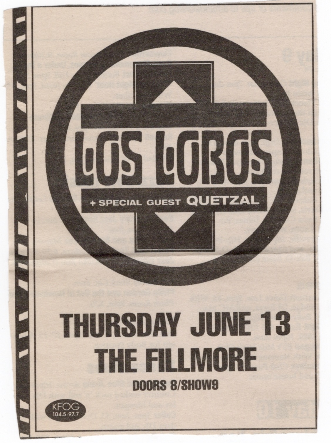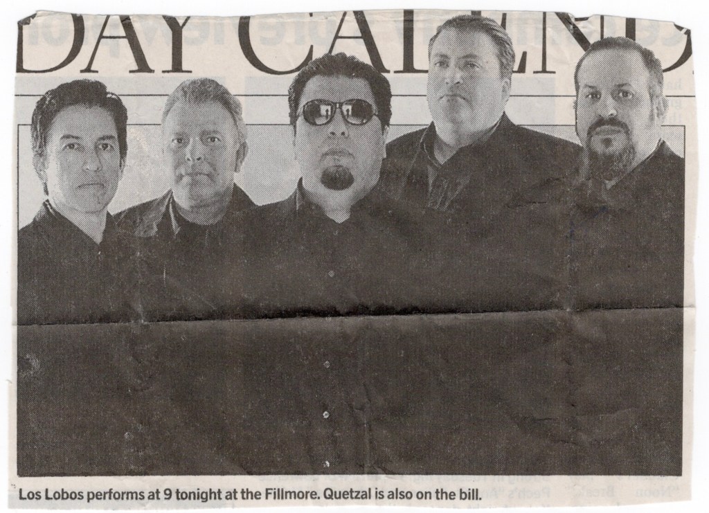 I was already exhausted by this, my ninth show in a row of an 11 show stretch, but I would never pass up a chance to see Los Lobos, not unless I had to. As I had written numerous times before, Los Lobos is one of those rare acts that you are absolutely certain to have an enjoyable performance as night follows day. This would also be the third show in a row I’d be ushering at The Fillmore and I once again manned my post guarding the front of house soundboard. I regret to say that although I was able to find the setlist online and had scanned and saved all ads and stuff from the cassette recording, for some inexplicable reason, the CDs of this night are missing in action. It’s not altogether too surprising considering the sheer volume of material I have to go through, but it is nonetheless disappointing, especially since as you might gather, that I hold Los Lobos in such high regard. It might turn up later, mistakenly put in some other box. It’s rare, but I’ve done it before.