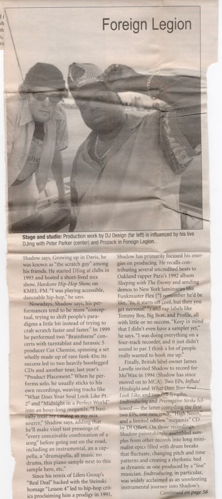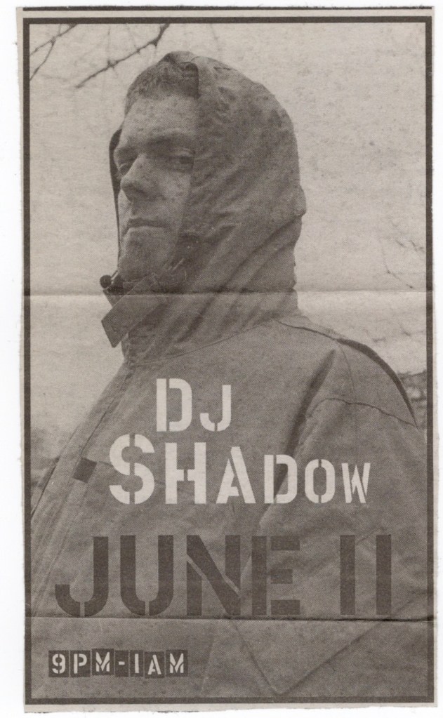 And I’m certain that his fears were also partially assuaged that night with the presence of Lyrics Born opening for him, his longtime collaborator and friend from his UC Davis days. Lyrics Born was still brand new back then and this would be the first of many times I’d see him and his band perform. His debut album “Later That Day” wouldn’t even be dropped until October of the following year on DJ Shadow’s Quannum record label. Lyrics Born is one of those perfect opening acts like The Mermen or M.I.R.V. who seem to wake up any new crowd effortlessly, no matter how few people had first arrived. Between songs he shouted, “Make some noise! My man Shadow, we’ve been down for years. He said we got some room on this bill. You wanna come and do a little something?… I said… Yeah” and then they did “I Changed My Mind” followed by “Hello”. They did both of those songs during the soundcheck as well as “Callin’ Out”, though they didn’t play that last one during their set.