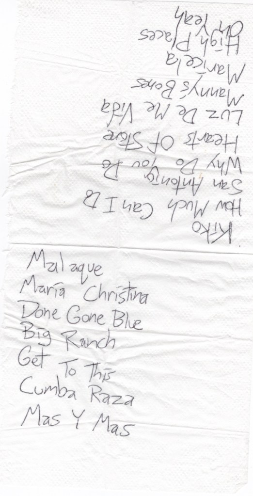 SETLIST : Kiko & The Lavender Moon, How Much Can I Do?, Ay Te Dejo En San Antonio, Why Do You Do, Hearts Of Stone, Luz De Mi Vida, Manny’s Bones, Maricela, High Places, Oh Yeah, Malaque, Maria Christina, Done Gone Blue, The Big Ranch, Get To This, Cumbia Raza, (encore), Good Morning Aztlan, Don’t Keep Me Wonderin’, Mas Y Mas