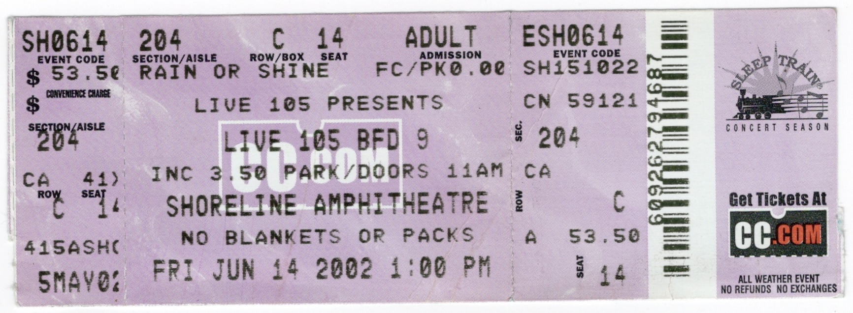 Seriously, I don’t know where I mustered the energy to endure this stretch of shows back then, though I was much younger, just a month shy of my 30th birthday. This was the 10th show in a row of an 11 show stretch and it was one of the B.F.D.’s to boot, an all day extravaganza of music from Live 105. It was the ninth year of this festival and although there were a couple notable heavy hitters on the bill, it wasn’t the best line up this time around. I was actually able to score decent seats at Shoreline, up in the front section, so the recordings came out great, though the first CD was unreadable. Sorry folks, I lost all of Hoobastank and Jimmy Eat World, but I have seen and recorded both a number of times before and since. The turntable wizards, The X-ecutioners, who I had seen earlier that year at The Fillmore were there too, but I missed them as well. I was blissfully unaware that N.E.R.D. was on the second stage that day, so I missed them too, though I would redeem myself catching them and Hoobastank three months later on the main stage at Shoreline for the Sprite Liquid Mix Tour.